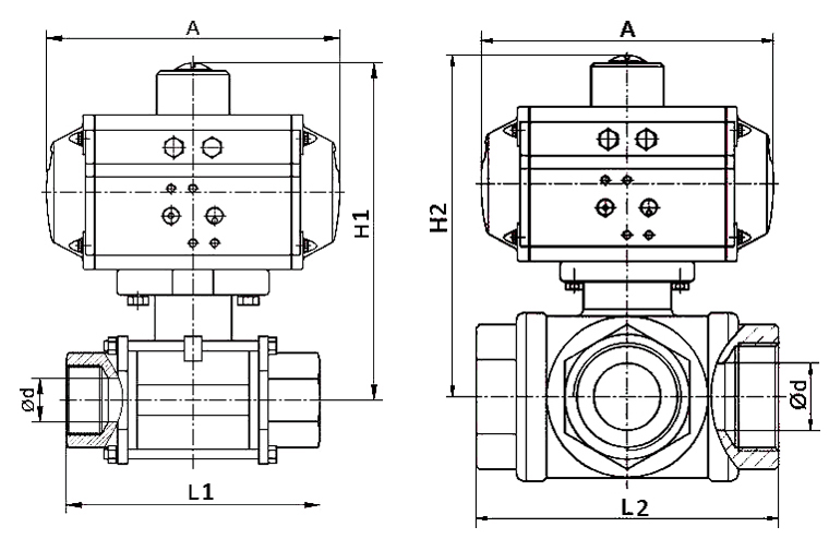 Compact 2 way/ 3 way ball valve with pneumatic actuator requires compressed air to work, which has such advantages as small fluid resistance, simple structure high performance and reliable sealing. It has been widely used in petroleum, chemical industry, power generation, paper making, atomic energy, aviation, rocket and other sectors, as well as daily life.