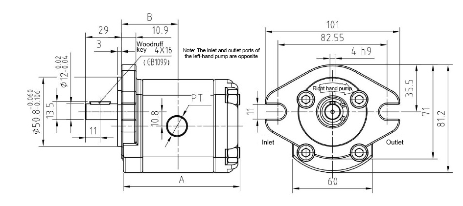 - Hydraulic single gear pump is suitable for SAE standard flange installation. The input shaft connection form is flat key shaft. Connection type of the oil inlet and outlet ports is threaded.