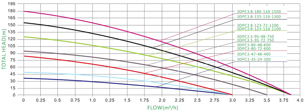 Max. Flow: 3.8m³/h, Max. Head: 123m, Model: 3DPC3.8-123-110-11001100W 110V DC water well pump high head performance curves