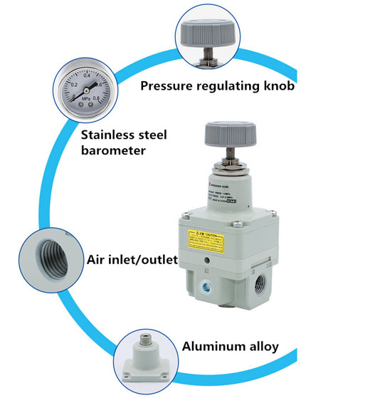 Air pressure regulator pressure regulator port size 1/8 inch Rc, G and NPT threads can be customized. The compressed air pressure regulator is small in size, light in weight and precise in pressure setting.