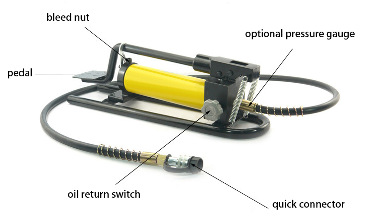 - The hydraulic foot pump can be connected to a variety of tools, including cutting machine, punching machine, bending machine, angle steel cutting tool, jack, puller, crimping tool, etc.