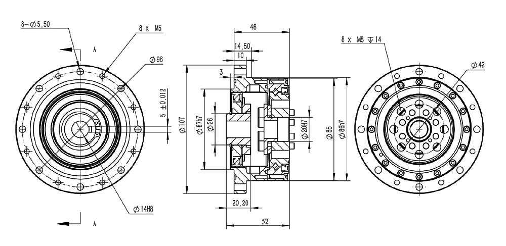 • It is a strain wave harmonic drive gearbox with high rigidity, no gear backlash and coaxial input and output.