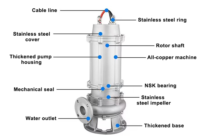 The pump consists of a motor and an impeller housed in a waterproof casing. The motor is hermetically sealed to prevent water entry, allowing the pump to operate while submerged. The impeller, driven by the motor, spins rapidly, creating a flow that transports sewage and solids from the inlet to the discharge.