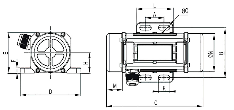 24 Volt DC brushed vibration motor, speed can be adjusted, force 20 Kg, 3000rpm, small size, suitable for applications like vibrating feeders, small vibratory machines, or devices requiring haptic feedback, where moderate vibration is needed.