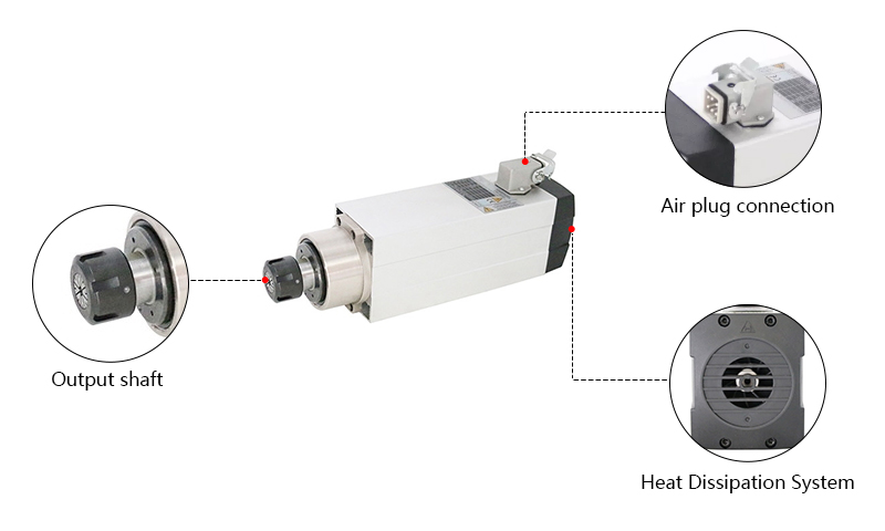 This series of air-cooled electric spindle motors mainly match with variable frequency drives or engraving machines, and CNC router machines, and are used for high-speed profiling, drilling, cutting, engraving, and groove milling of wood, metal, plastics, foam, rubber, and other materials.