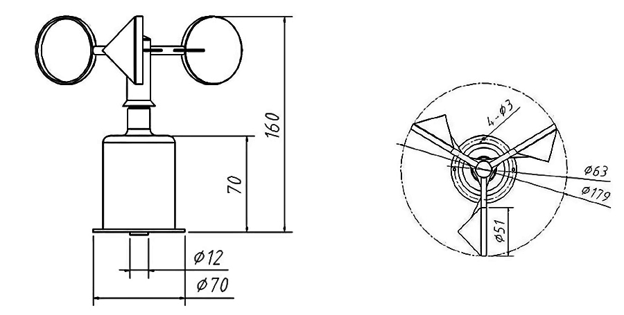 3-Cup Anemometer Dimension Diagram (Unit: mm)