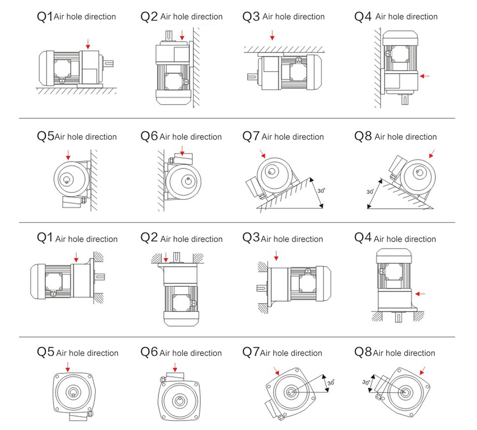 • In the diagram, Q1, Q4, Q7, Q8 are the standard types of oil hole direction. If you need the air hole be on a special position, please contact us to modify the air hole direction.