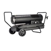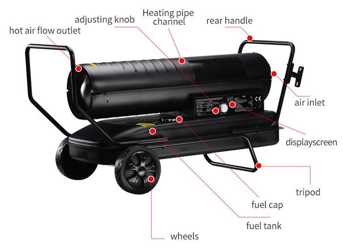 Portable electric fan heater function on diesel fuel, with 50kW power capacity, high quality and best price, single phase 110V/60Hz, 220V/50Hz power supply, 50L fuel tank, IPX4 waterproof class, heating area up to 1020m3, equiped with rear handle and wheels to move easily.