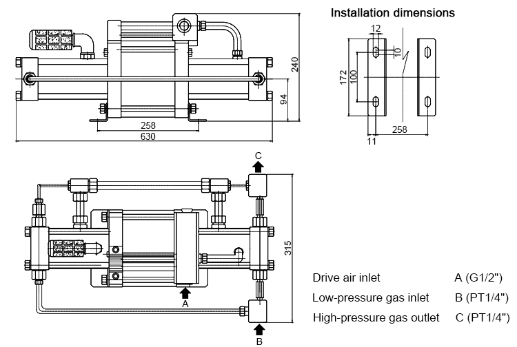 60: 1 air Pressure Booster, with 215 L/min maximum flow at driven air pressure of 40 bar, The air booster pump has 25-480 bar (362- 6961 psi) gas inlet pressure, the maximum gas outlet is 480 bar.
