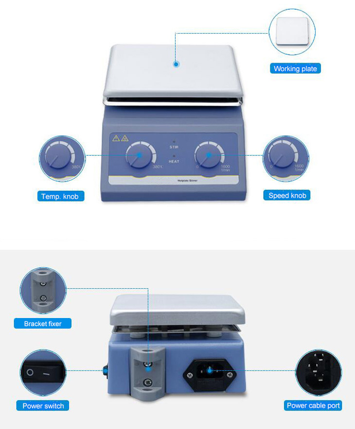 5. The hotplate stirrer should be kept clean and dry. Strictly prohibit the solution into the machine, so as not to damage the machine. It should cut off the power supply when not working.
