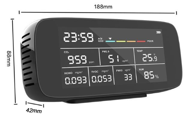 - Multifunctional air quality monitor for dust (PM2.5/PM10), formaldehyde, TVOC detection.