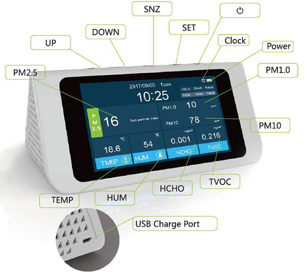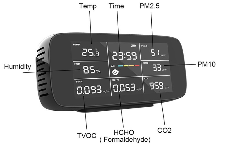 High accuracy indoor air quality detector is used to perform the detection of PM2.5/PM10, formaldehyde (HCHO), total volatile organic compounds (TVOC), temperature, humidity and air quality index (AQI), suitable for home, car and public place.