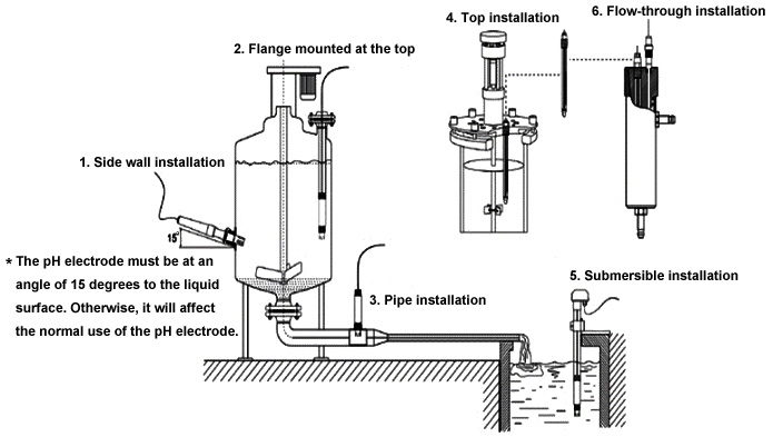 1. Side wall installation (*The pH electrode must be at an angle of 15 degrees to the liquid surface. Otherwise, it will affect the normal use of the pH electrode.)