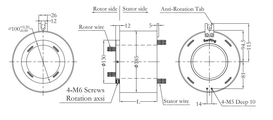 100mm Hole Diameter/185mm Outer Diameter Through Bore Slip Ring Dimension Drawing (unit:mm)