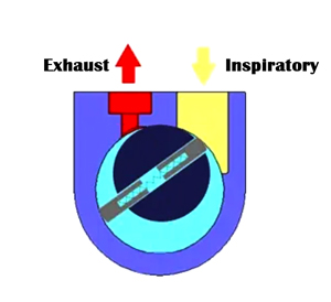 When space A is isolated from the suction port, i.e. turned to the position of space B, the gas begins to be compressed, the volume is gradually reduced, and finally connected to the exhaust port. When the compressed gas exceeds the exhaust pressure, the exhaust valve is pushed open by the compressed gas, and the gas is discharged to the atmosphere through the oil layer in the tank.