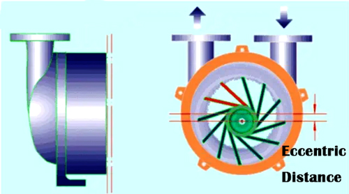 As the pump casing is not concentric with the impeller, the air intake space between the right half of the hub and the water ring is gradually enlarged, thus forming a vacuum, so that the gas enters the air intake space in the pump through the air intake pipe.