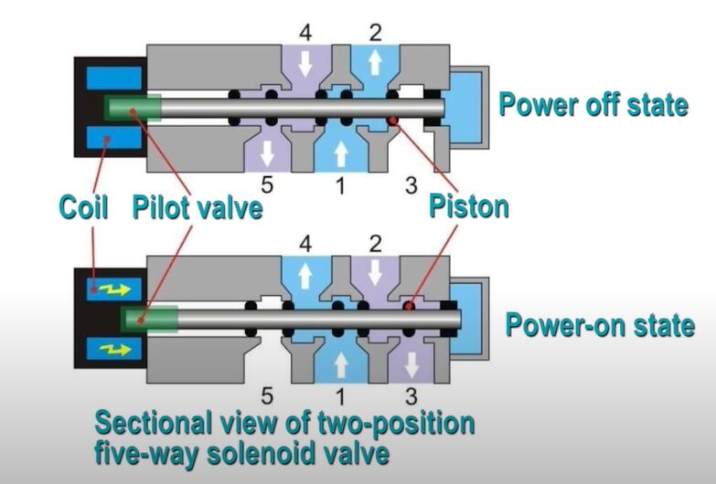 In the initial position, 1 is the air inlet, 2 is the air outlet(normally open), and 3 is the air outlet (normally closed). 3 and 5 are vents. When the solenoid valve coil is energjized, the iron core gets electromagnetic force to make the piot valve actuate, use the 2 and 4 holes to change direction, and discharge the gas in the 2 holes.