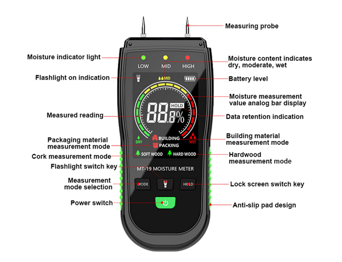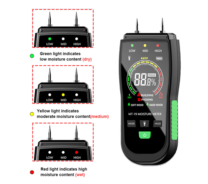 Buy a pin-type digital moisture detector for measuring the moisture content of wood/walls/cartons/building materials. Handheld moisture tester is equipped with hand-operated electric lighting, four-mode switching, over-range alarm, high-sensitivity probe, large-screen high-definition display, data retention, automatic shutdown, replaceable probe and other functions.